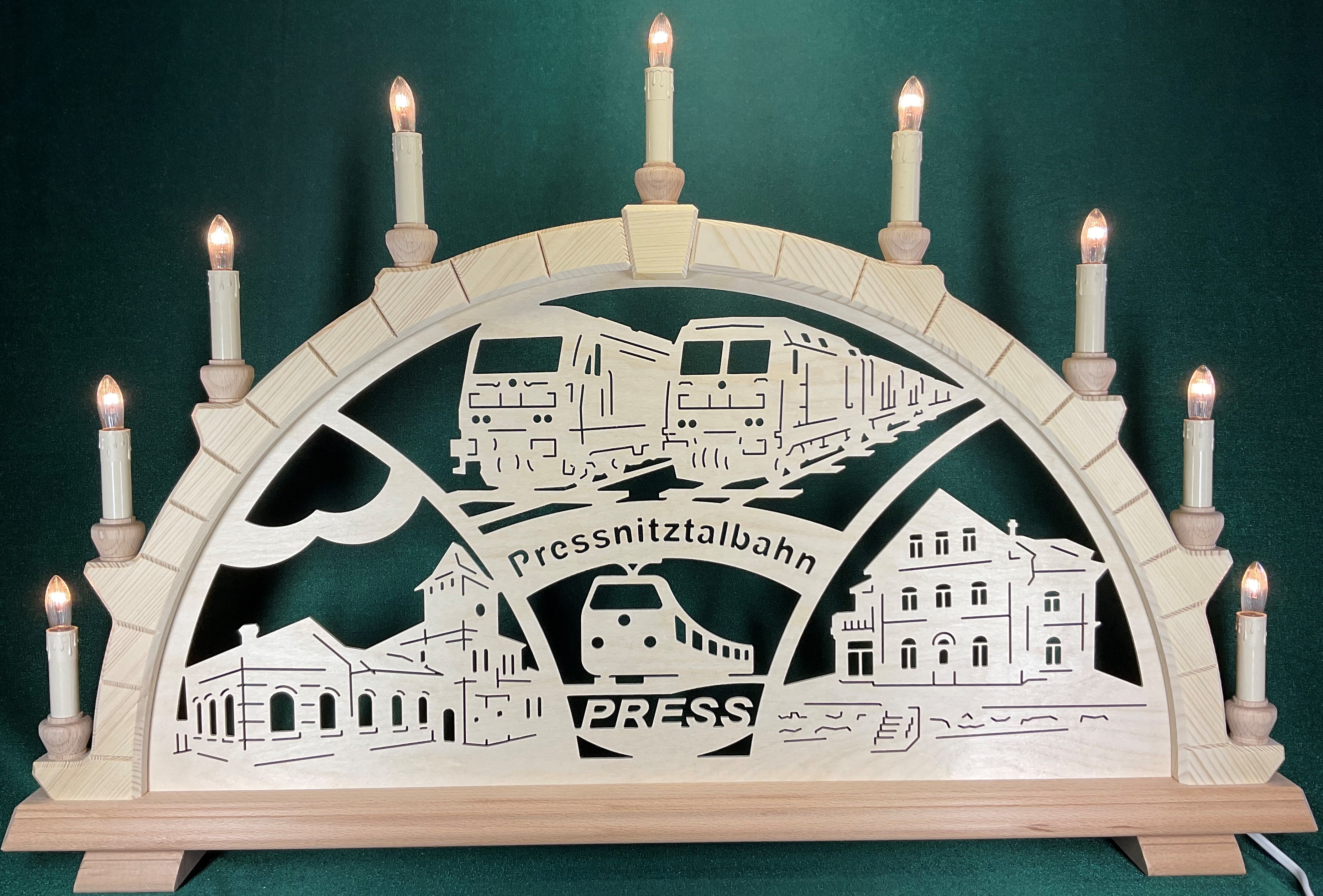 Von jedem verkauften Schwibbogen aus unserer Preßnitztalbahn-Serie gehen 5.- € als Spende zugunsten des Wiederaufbaus der Preßnitztalbahn !
