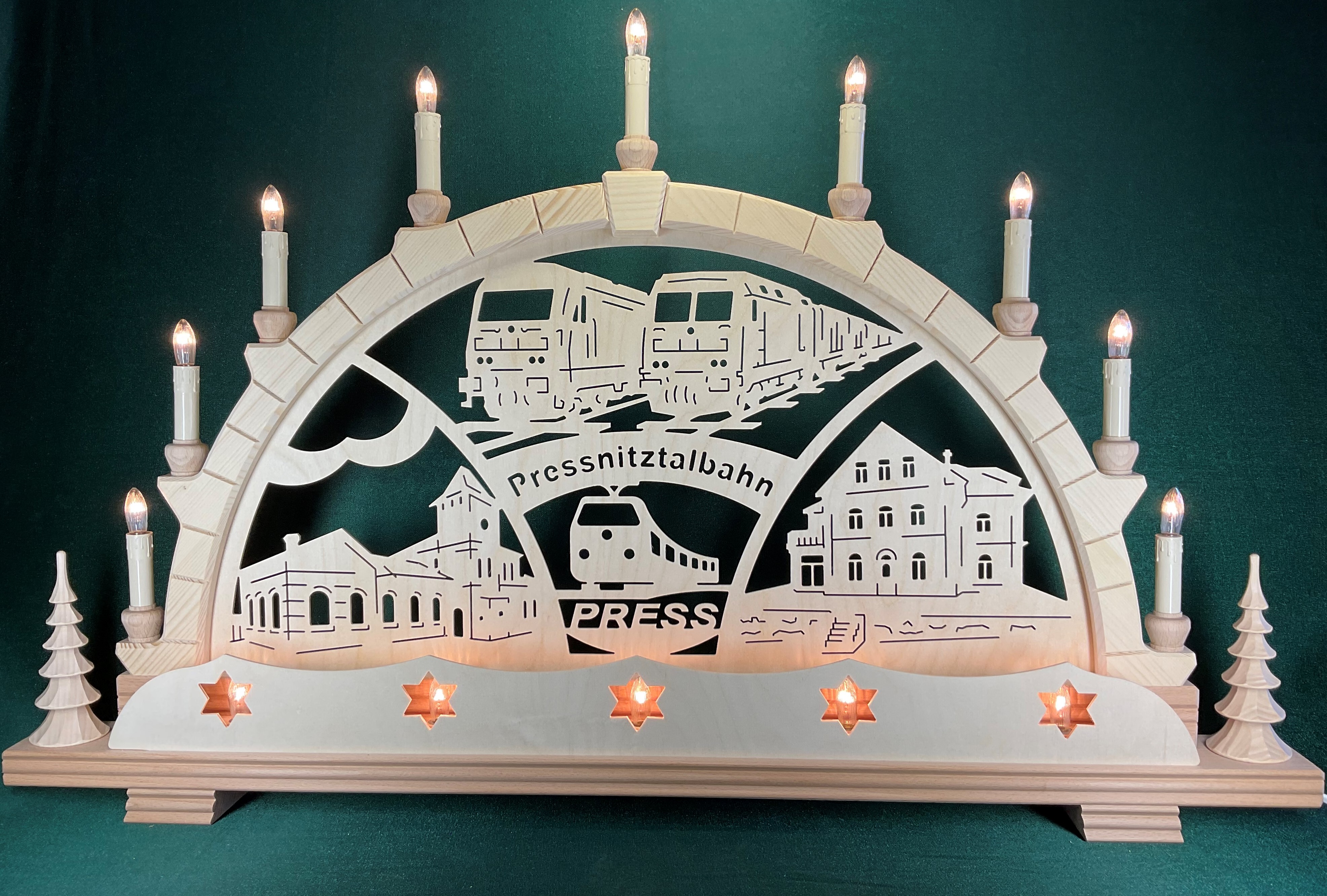 Von jedem verkauften Schwibbogen aus unserer Preßnitztalbahn-Serie gehen 5.- € als Spende zugunsten des Wiederaufbaus der Preßnitztalbahn !