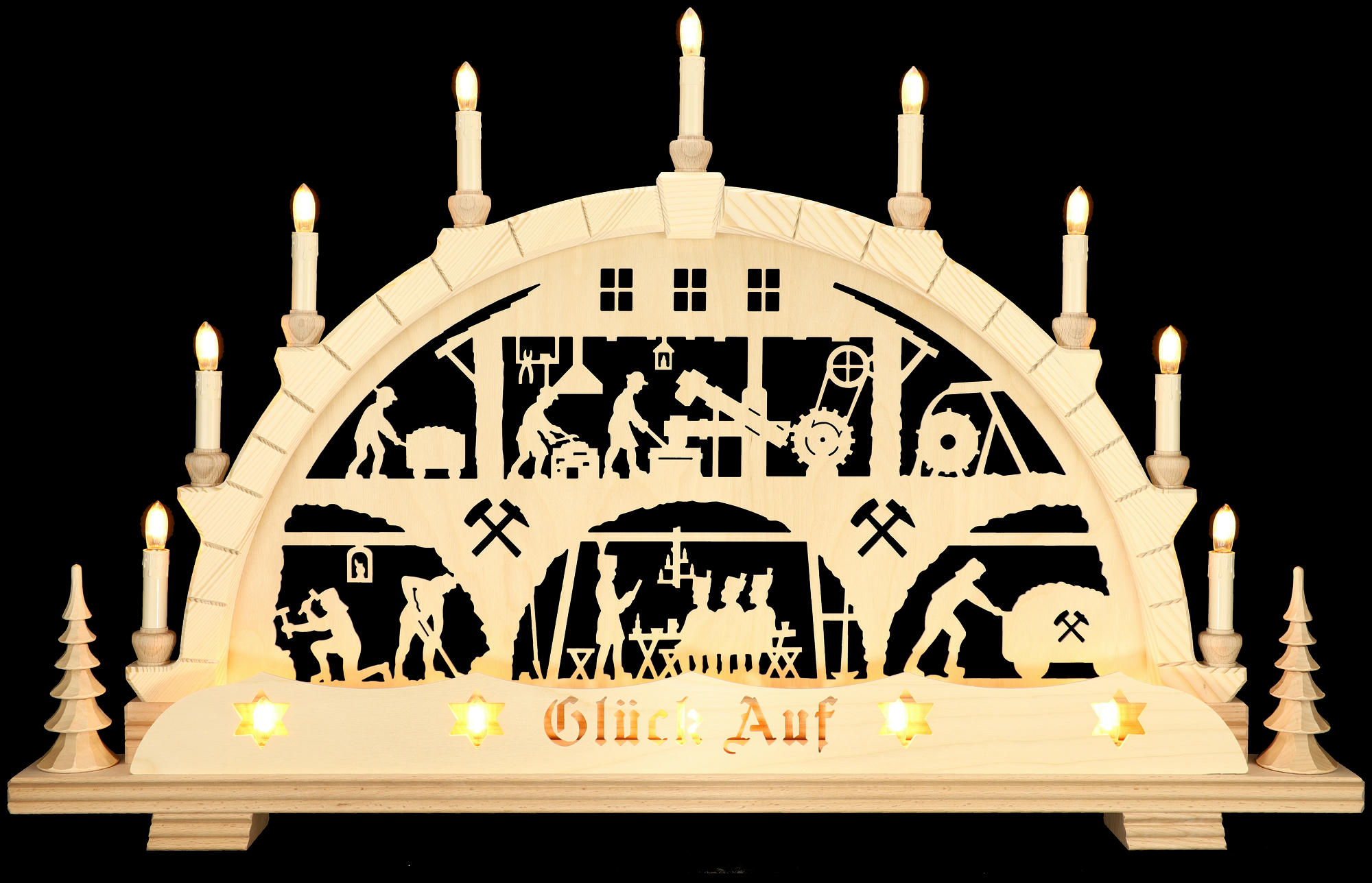 Alle Schwibbögen werden in solider Handarbeitsqualität aus heimischen Hölzern und VDE-geprüften Elektrobauteilen in traditioneller, erzgebirgischer Handarbeit hergestellt.