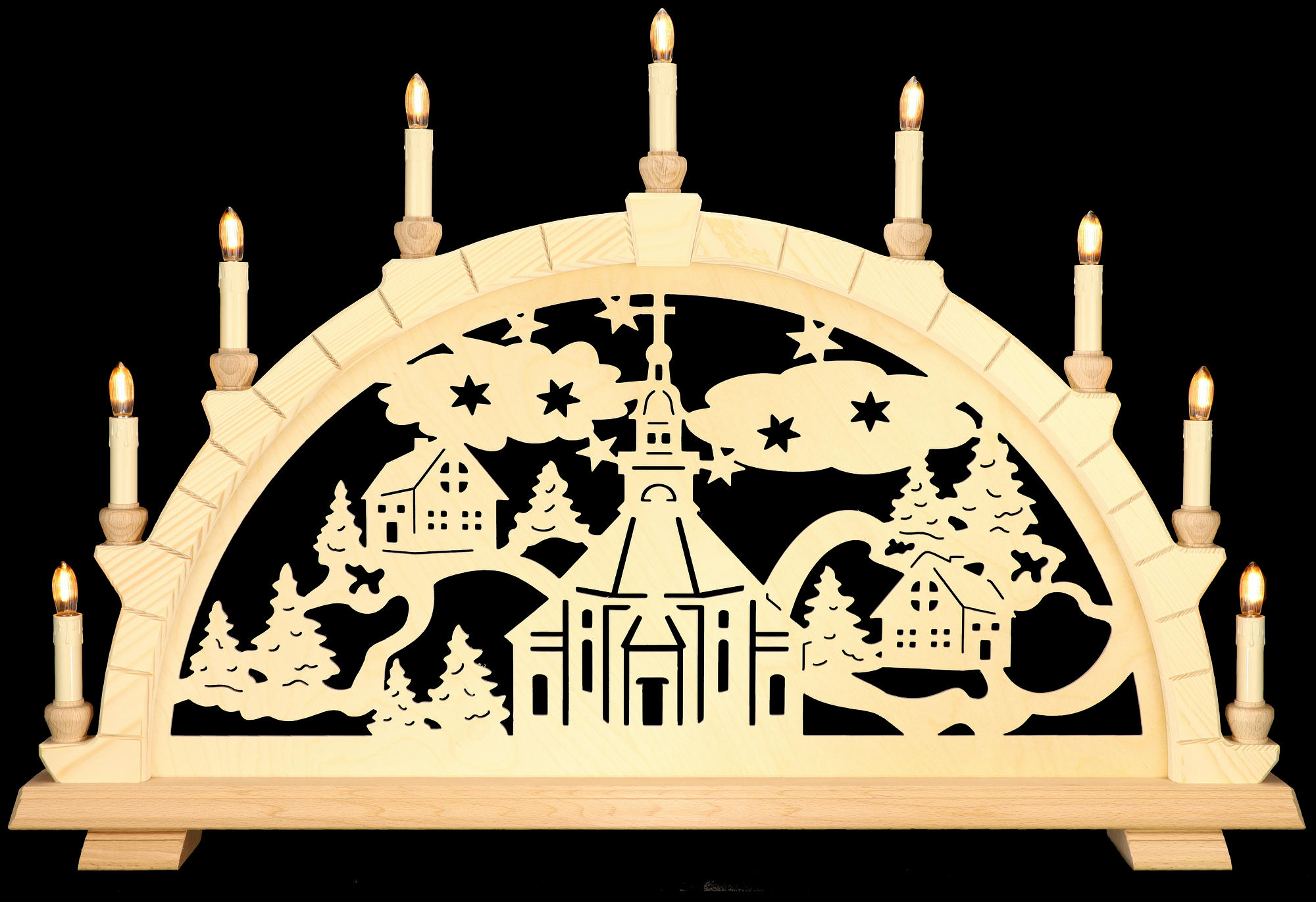 Dieser Schwibbogen wird mit 34 Volt / 0,2 Watt LED Filamentspitzkerzen mit warmweißen Licht ( ähnlich herk. 3 Watt Spitzkerzen), Anschlusskabel (inkl. Schalter, Eurostecker) und Ersatzkerze geliefert.