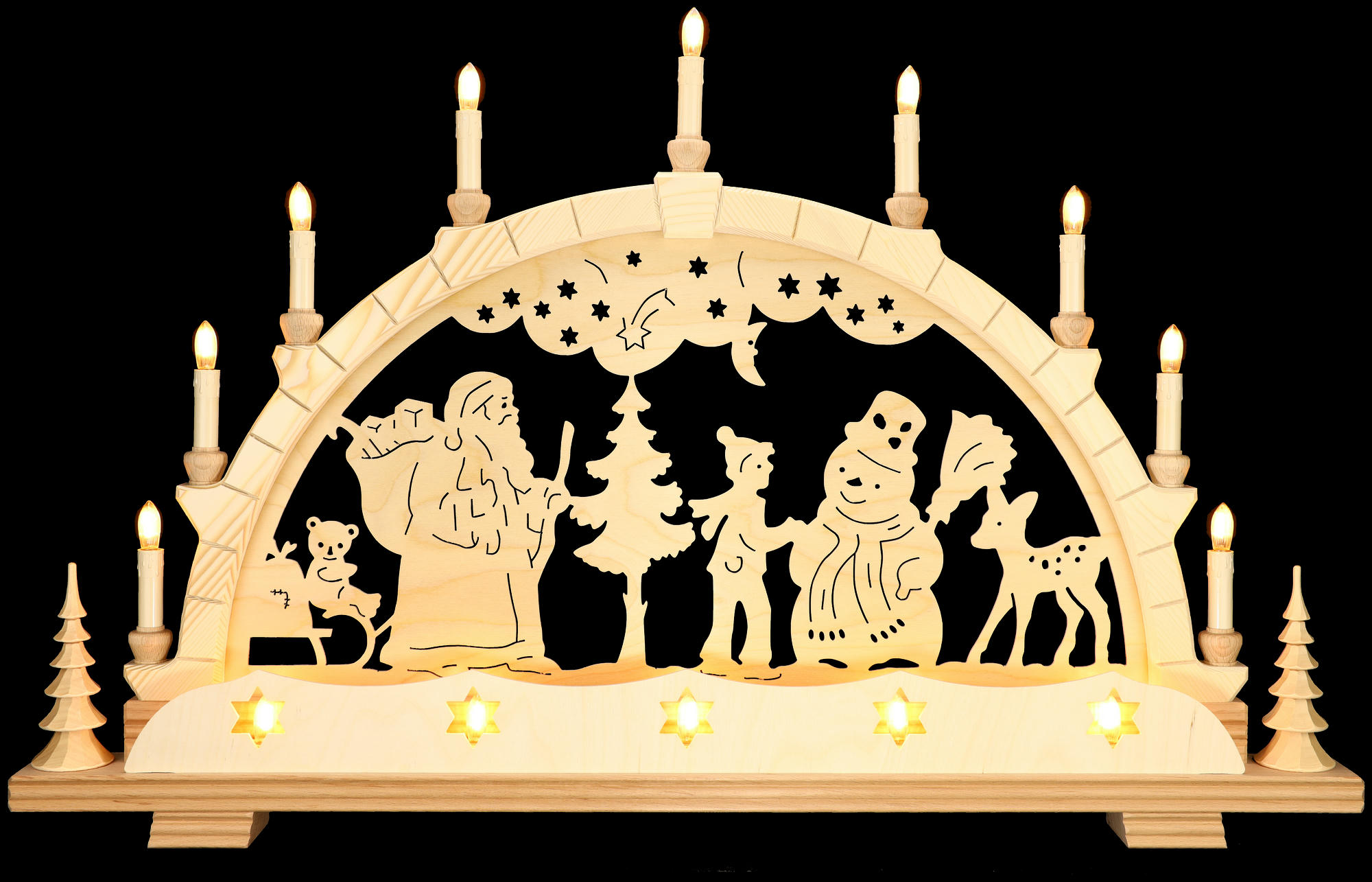 Motiv: Weihnachtsmann mit Vorderbeleuchtung und 2 handgeschnitzten Bäumen.